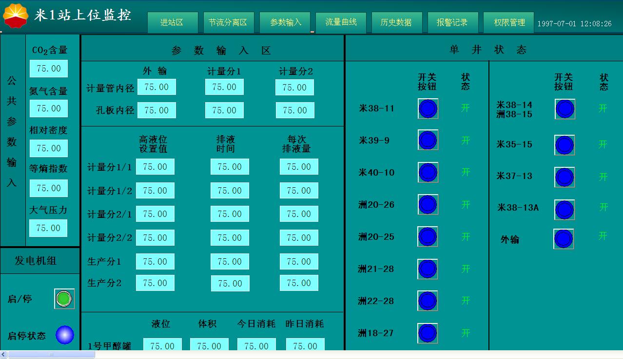 界面主要分进站区、节流分离区、参数输入、流量曲线、历史数据、报警记录和权限管理组成。